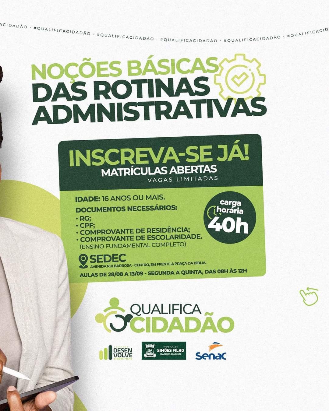 A Secretaria de Desenvolvimento Econômico (SEDEC) anunciou a abertura das inscrições para o aguardado programa de capacitação profissional, o Qualifica Cidadão. Com foco em fortalecer as habilidades essenciais para o mercado de trabalho, o curso oferece um conjunto abrangente de disciplinas, incluindo noções básicas de rotinas administrativas, logística e distribuição.